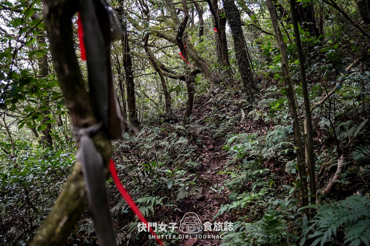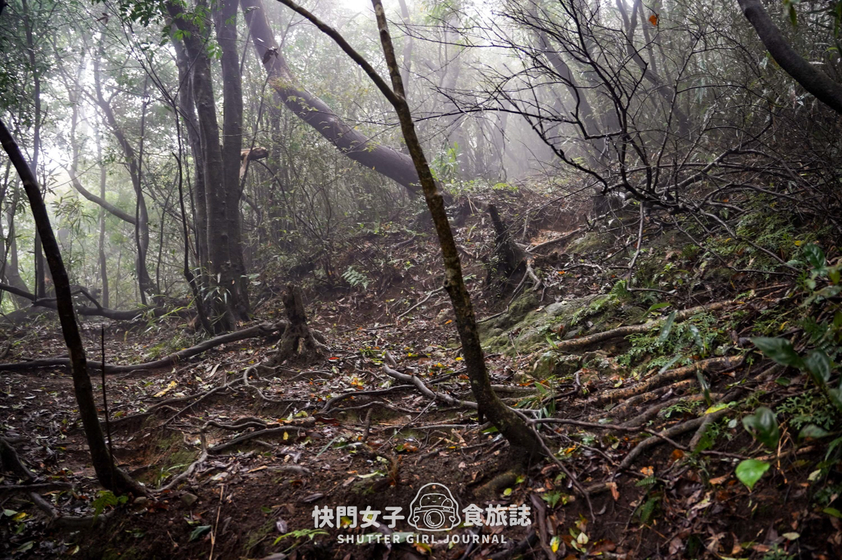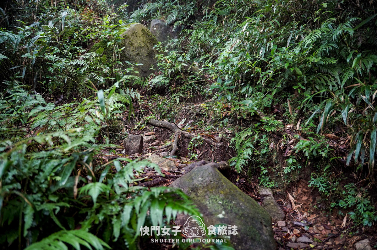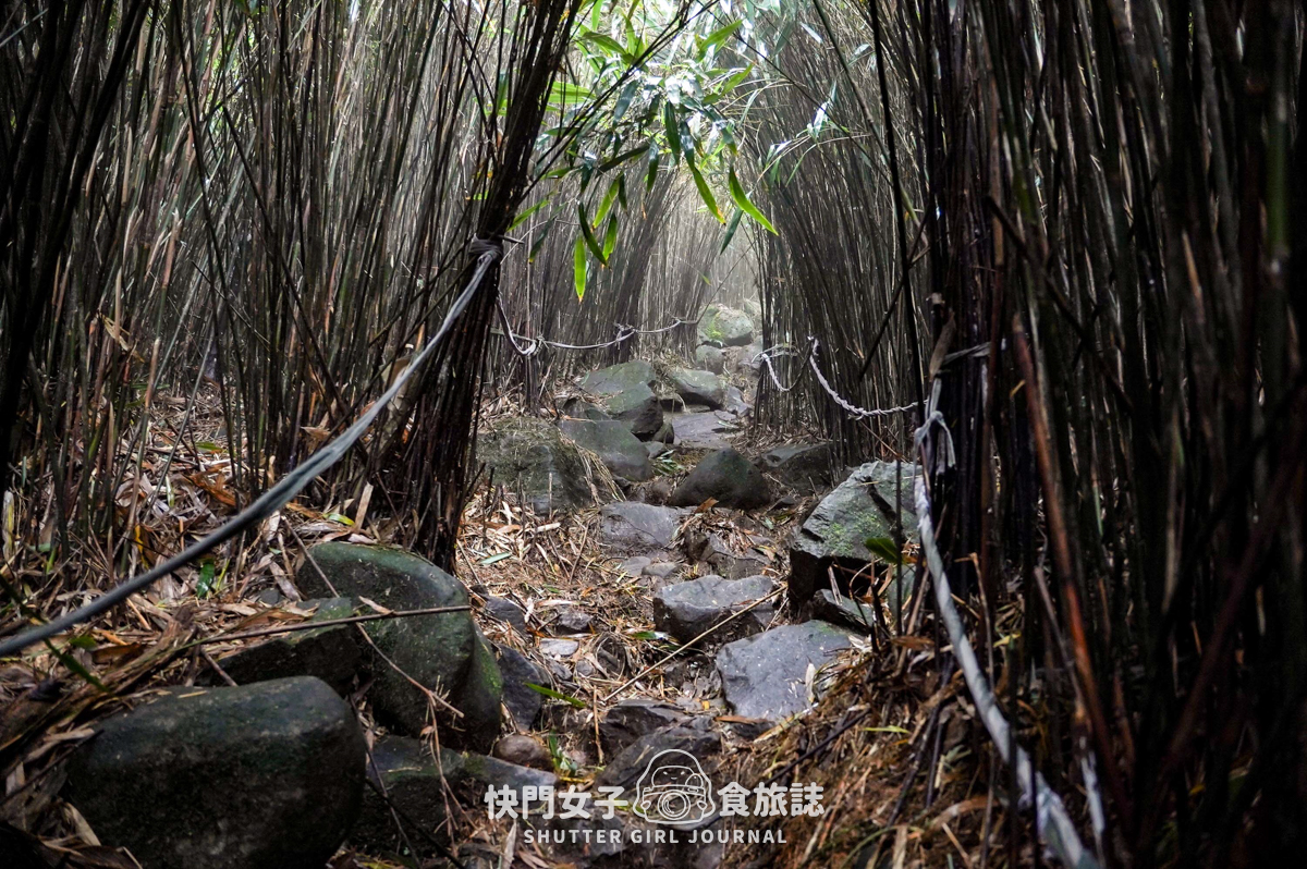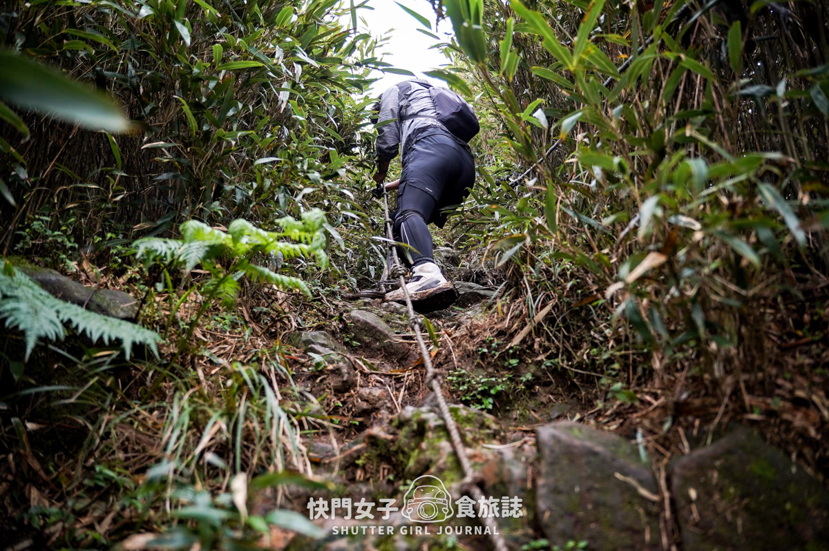 上攀的路段幾乎是大石塊+竹林,因為曬不到陽光所以幾乎都是溼滑的地段,建議戴手套+登山杖+拉繩