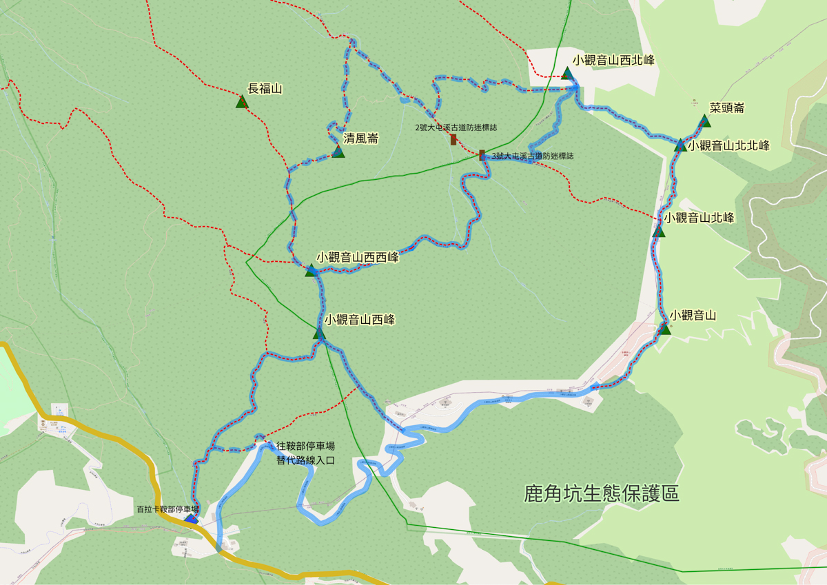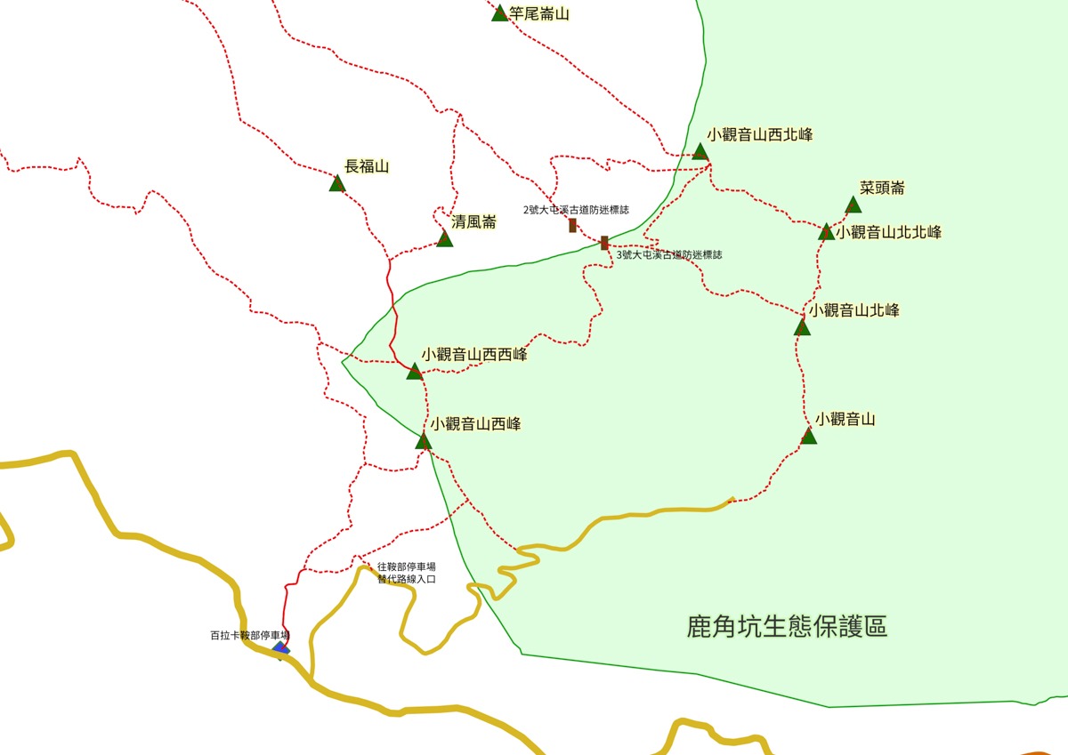 鞍部停車場→山之家→小觀音西峰→小觀音西西峰→大屯溪古道→3號防迷標誌