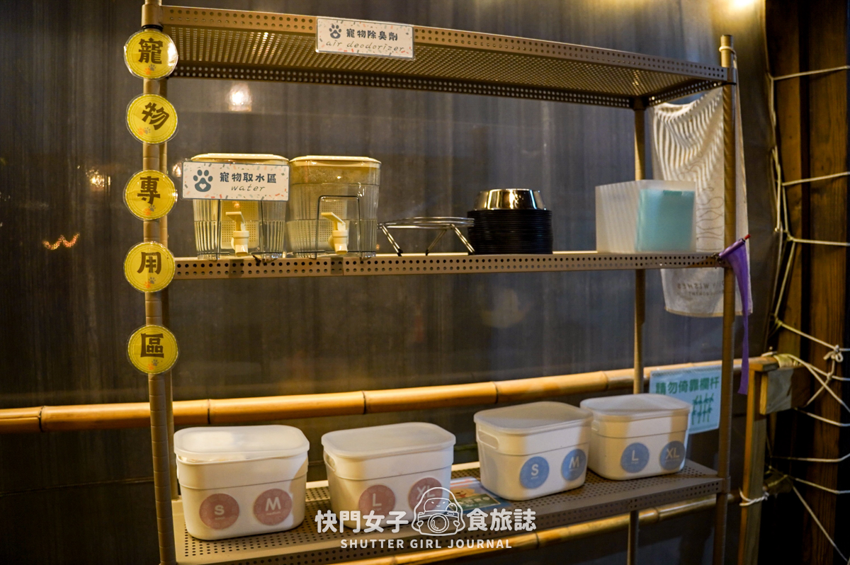 寵物和主人可以在另一區一起用餐,旁邊的架子上也都有飲用水、盤子可以使用,真的算是一個對寵物很周到的空間