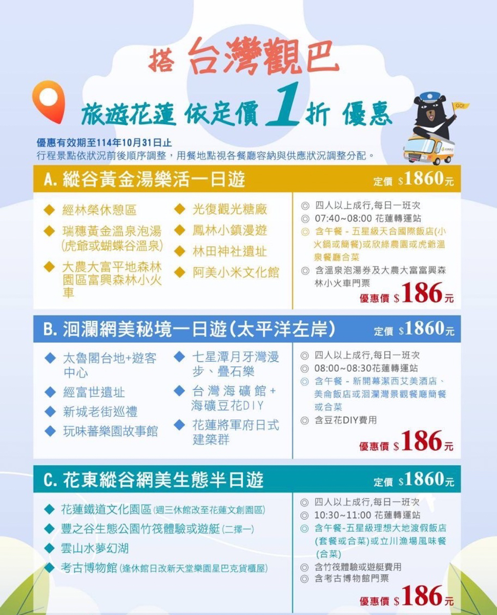 這個觀光巴士的花蓮旅遊有三種方案,分別是: