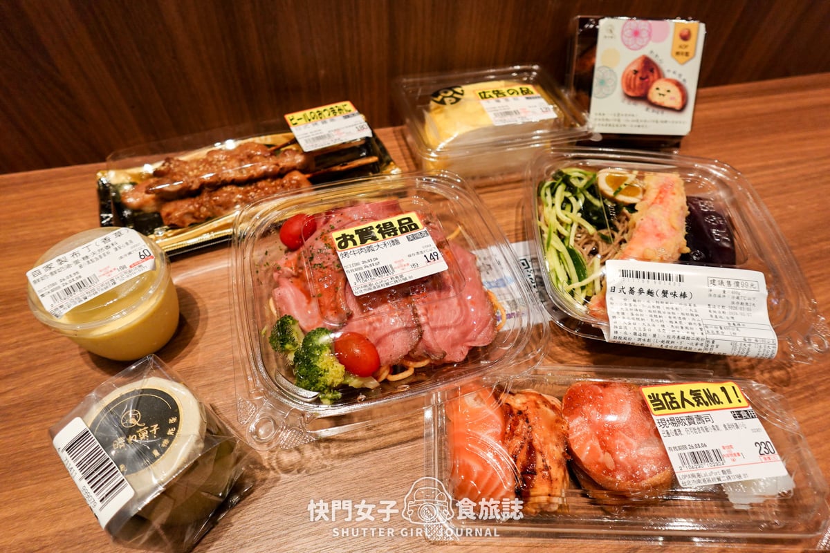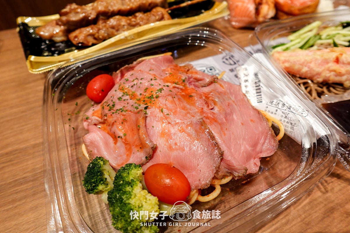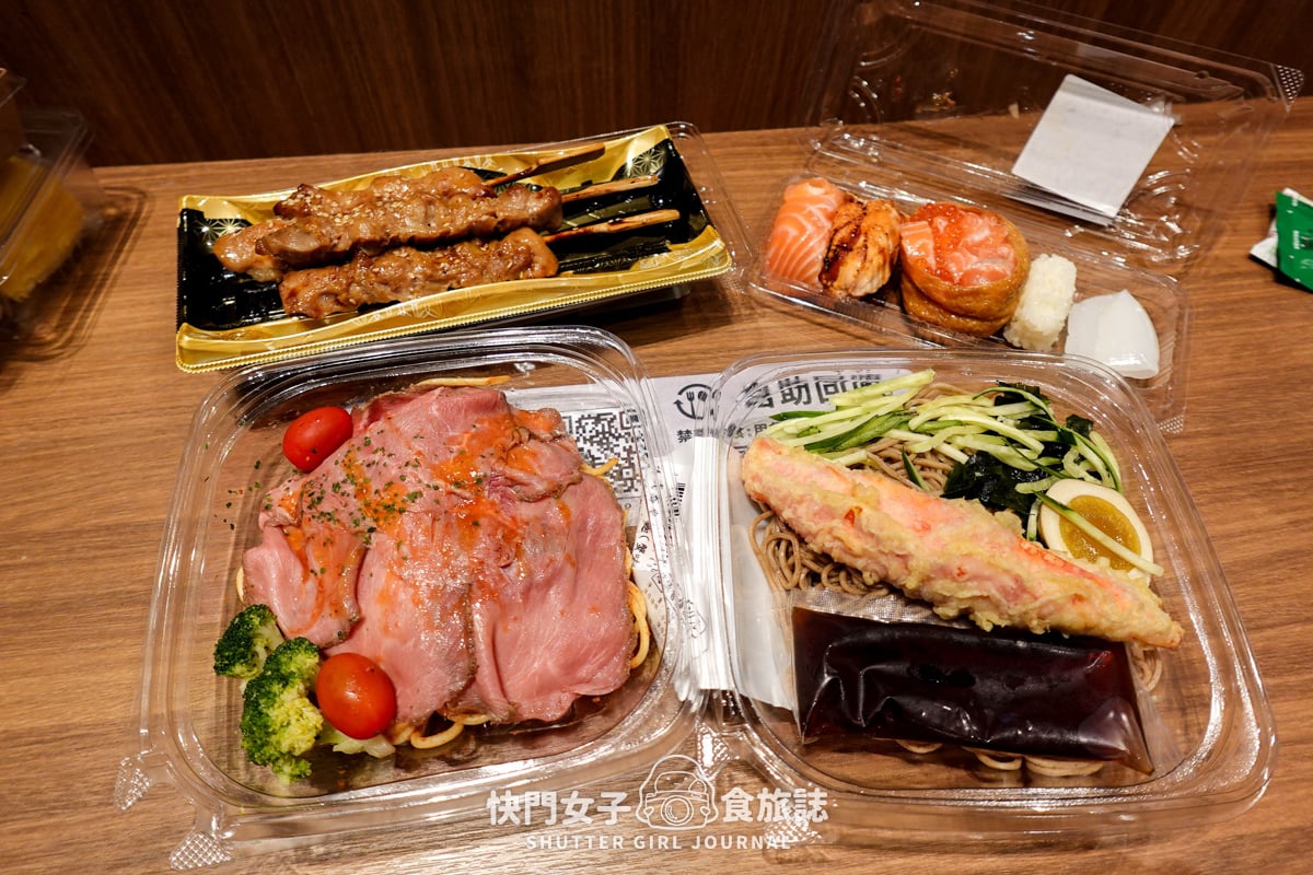 這次我們買了烤牛肉義大利麵、蟹味棒蕎麥麵、現做壽司、烤雞肉串