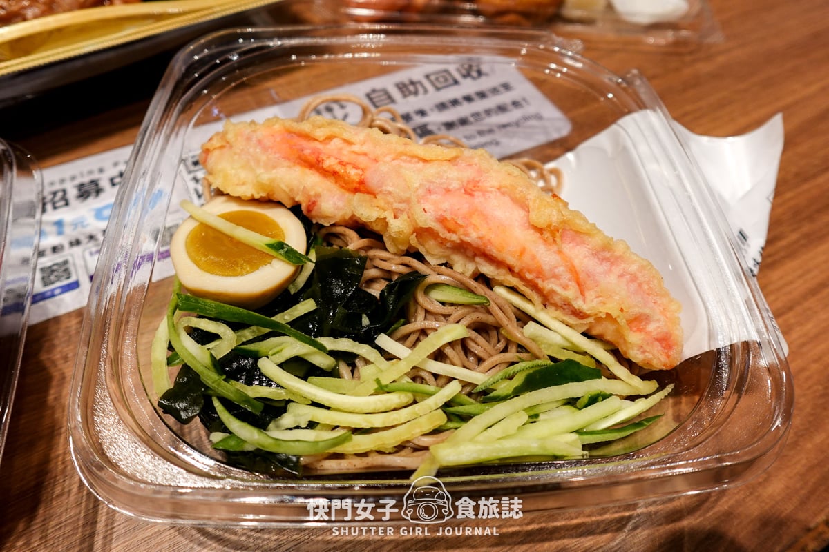 內容物有蕎麥麵、海帶、小黃瓜絲、半顆溏心蛋,和一大份的蟹味棒