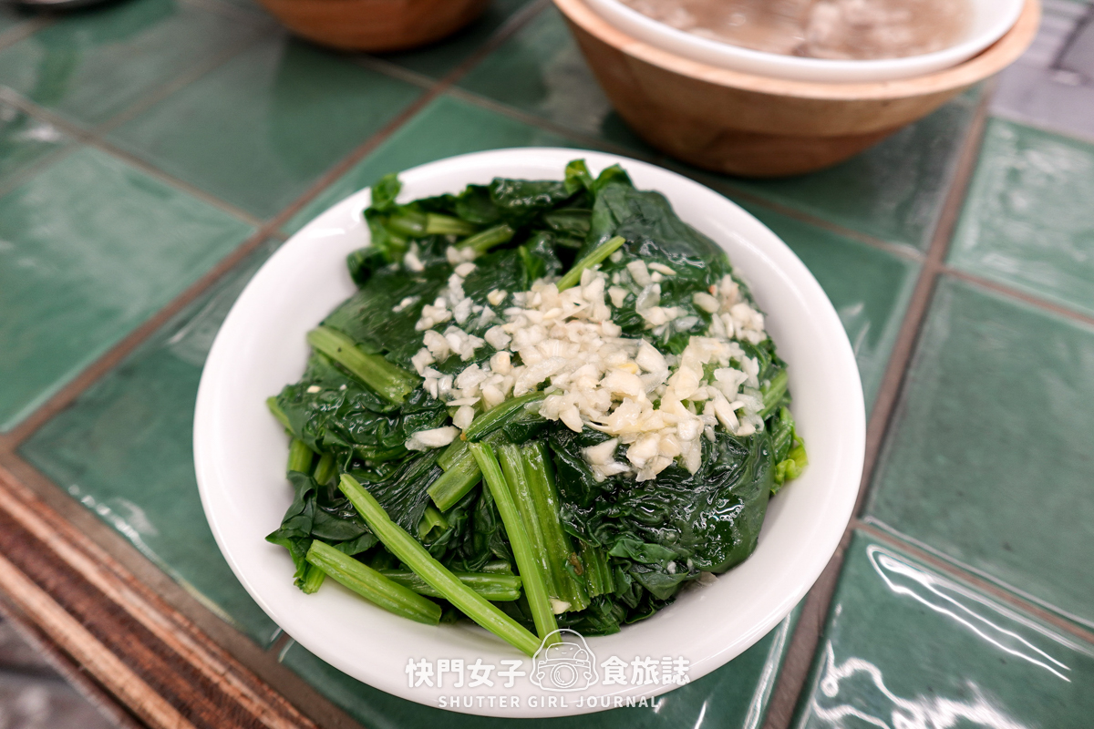 這次提供的是菠菜,算是川燙+鹽巴調味,是很清爽的一道菜,上面灑了不少蒜碎
