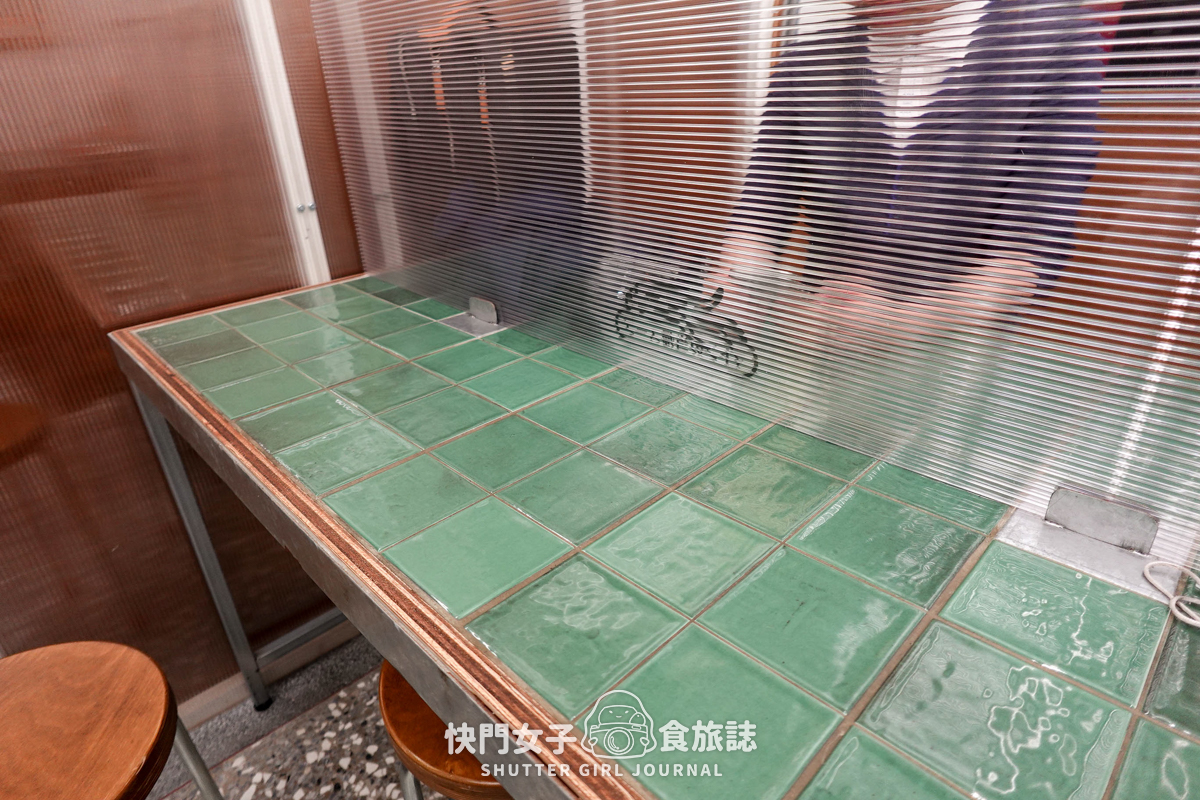 桌面是濁綠色的亮面磁磚,我覺得非常特別