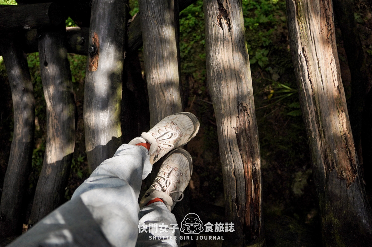 真的非常不建議穿一般休閒鞋、帆布鞋,走一小段還好,但若要走完整段圓木棧道,腳底板會非常不舒服,因為底部是圓的,腳底板會一直被壓迫噢